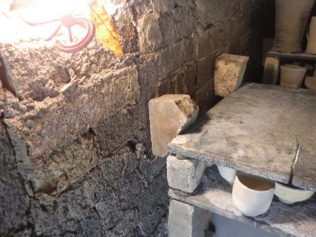 窯詰 1段目に壺を入れる前に棚と窯壁の間にレンガの楔を入れて倒れないようにしています、一番前は丸太を前の焚口から入れるので転倒防止です。3段目から前に棚板に籾灰を使っています。窯焚きの灰がいっぱい飛ぶのでくっつき防止と窯焚き後の掃除が少しでも簡単になるようにです。 1段目が詰め終わりました。 窯詰と並行して原木の小切りをしています、今度の窯焚きにも丸太を使います。手の使いすぎと病気のため指が痛くなり一指し指が使えなくて少し不便です。 共有: クリックして X で共有 (新しいウィンドウで開きます) X Facebook で共有するにはクリックしてください (新しいウィンドウで開きます) Facebook いいね 読み込み中… 関連 投稿者: morishige218 焼き物製造 morishige218 のすべての投稿を表示