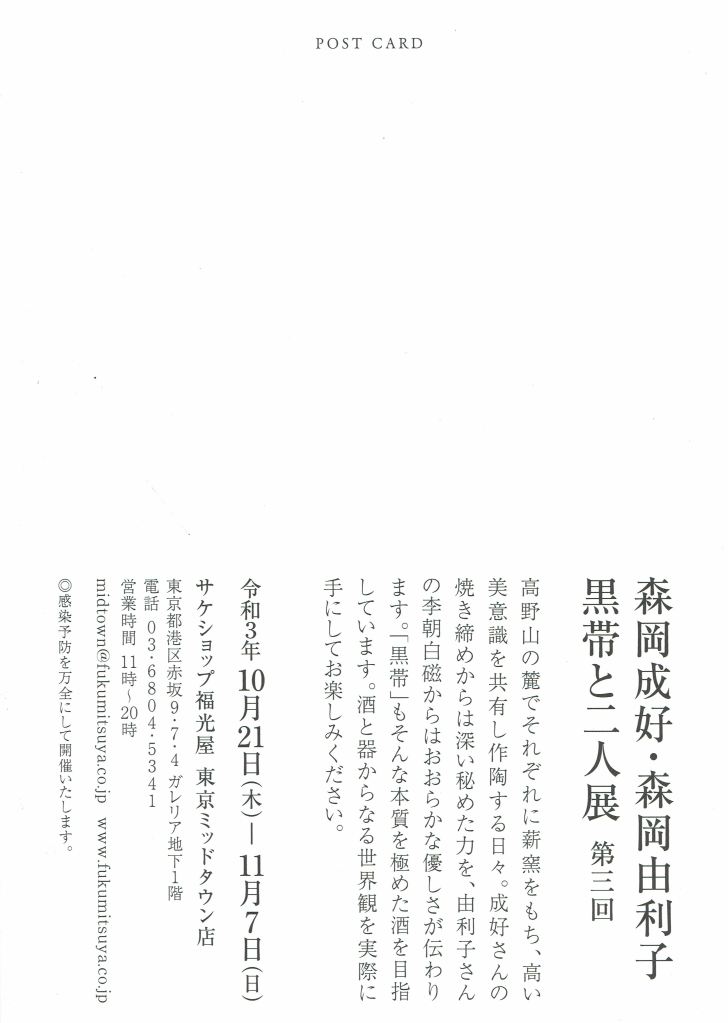 展覧会 昨日は溜まっていた所用で高野山、下の町へ今月21日から11月7日まで福光屋で展覧会します。 23日から萬器で由利子が展覧会です。今日は白磁の窯出ししました。いい焼けになっています。写真を載せたいのですがカメラをどこに置いたか?明日明るくなってから探します。 共有: クリックして X で共有 (新しいウィンドウで開きます) X Facebook で共有するにはクリックしてください (新しいウィンドウで開きます) Facebook いいね 読み込み中… 関連 投稿者: morishige218 焼き物製造 morishige218 のすべての投稿を表示